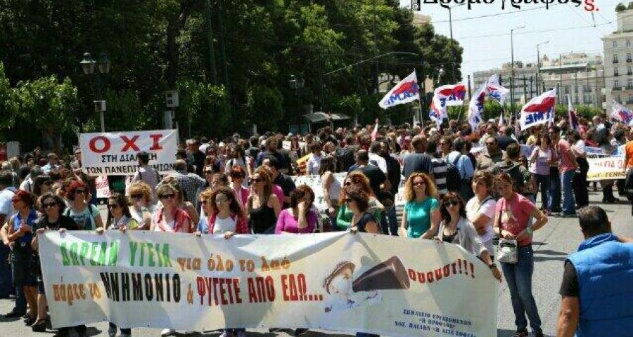 Λίγο μετά τις 13:30 οι απεργοί υπάλληλοι των ΑΕΙ και οι εργαζόμενοι στα δημόσια νοσοκομεία ξεκίνησαν κοινή πορεία προς το υπουργείο Διοικητικής Μεταρρύθμισης, ενάντια στη διαθεσιμότητα.