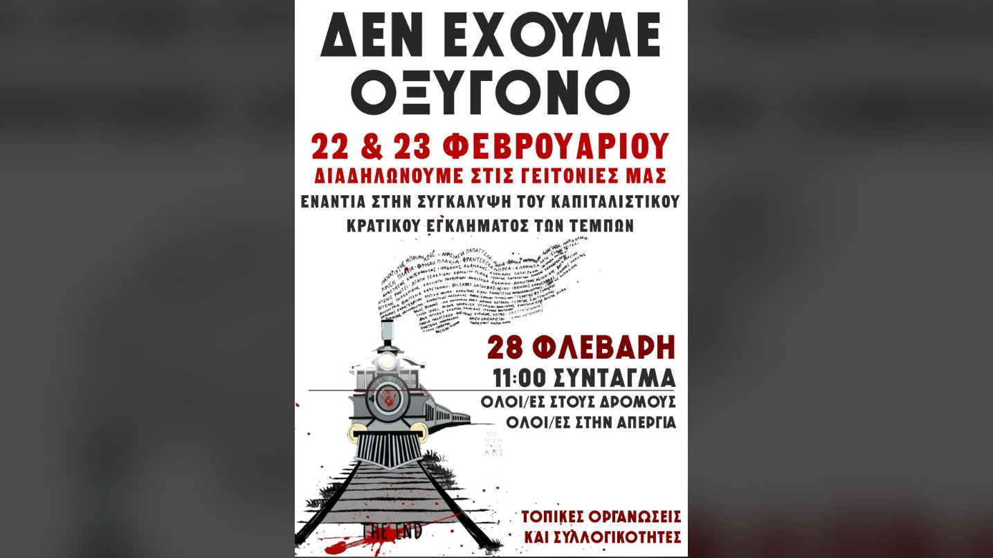 Σάββατο και Κυριακή 22 και 23 Φεβρουαρίου διαδηλώνουμε στις γειτονιές μας ενάντια στην συγκάλυψη του καπιταλιστικού κρατικού εγκλήματος των Τεμπών.