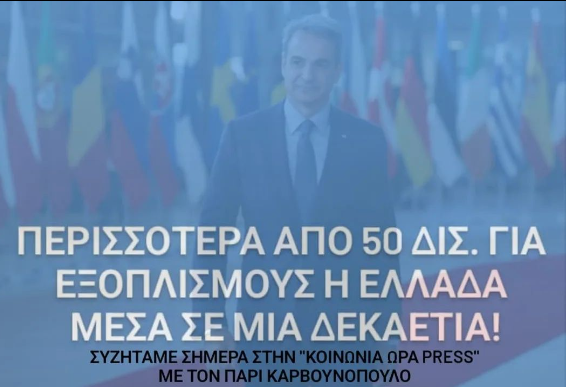 Ο Πάρις Καρβουνόπουλος είναι δημοσιογράφος από το 1986. Από το 1993 καλύπτει το ρεπορτάζ του ΥΠΕΘΑ. Καλεσμένος σήμερα της Γ. Κριεμπάρδη και Ν. Ψαράκη, στην εκπομπή Κοινωνία Ώρα Press, στις 17.00, αποκαλύπτει αναλυτικά με στοιχεία και αριθμούς τι δίνουμε, για τι και γιατί. Μιλάμε για τα κυβερνητικά επικοινωνιακά παιχνίδια, σε βάρος σημαντικών κοινωνικών τομέων (πχ υγεία, παιδεία).