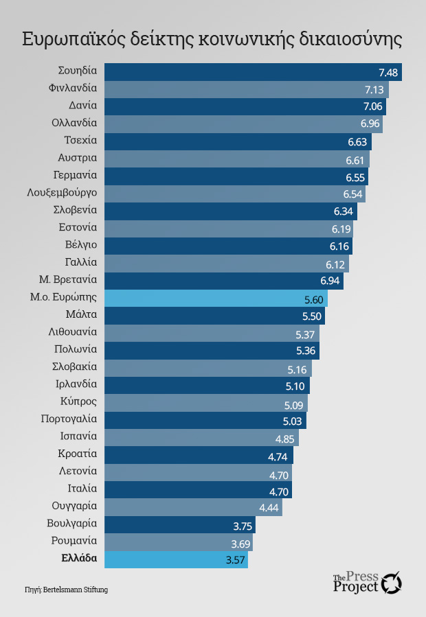 Η Σουηδία (7,48), η Φινλανδία (7,13), η Δανία (7,06) και η Νορβηγία (6,96) είναι οι 4 χώρες με τις καλύτερες επιδόσεις στο πεδίο της κοινωνικής δικαιοσύνης.