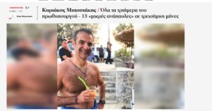 Διαπράττει μάλιστα την αθλιότητα η «Αυγή» να χαρακτηρίζει «ανάπαυλες» τις περιοδείες του πρωθυπουργού σε διάφορες περιοχές της χώρας όπως η Μεσσηνία, τα Γιάννενα, το Ηράκλειο, το Ρέθυμνο, τα εγκαίνια νοσοκομείου στη Χαλκίδα, την παρουσίαση προγράμματος ηλεκτροκίνησης στην Αστυπάλαια, ακόμη και την παρουσία του στο μνημόσυνο του πατέρα του στα Χανιά.