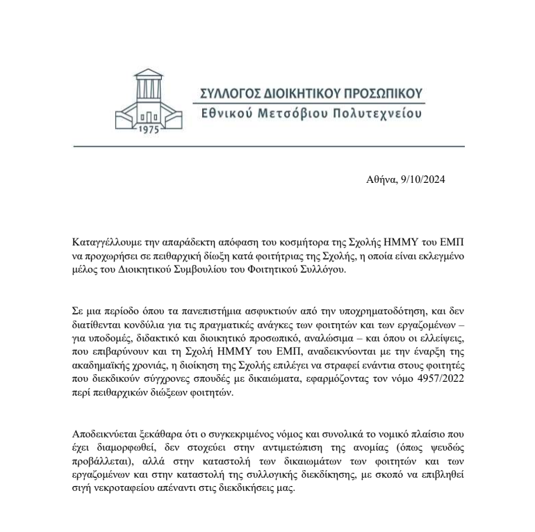 Ο Σύλλογος Ειδικού και Εργαστηριακού και Διδακτικού Προσωπικού του Εθνικού Μετσόβιου Πολυτεχνείου εκφράζει επίσης την «πλήρη αντίθεση του στην συνδικαλιστική δίωξη φοιτήτριας από τον κοσμήτορα της σχολής» κατηγορώντας τον ότι κάνει χρήση του «αντεργατικού νόμου που η ψήφισε το 2022 η Νέα Δημοκρατία για την ποινικοποίηση του συνδικαλισμού».