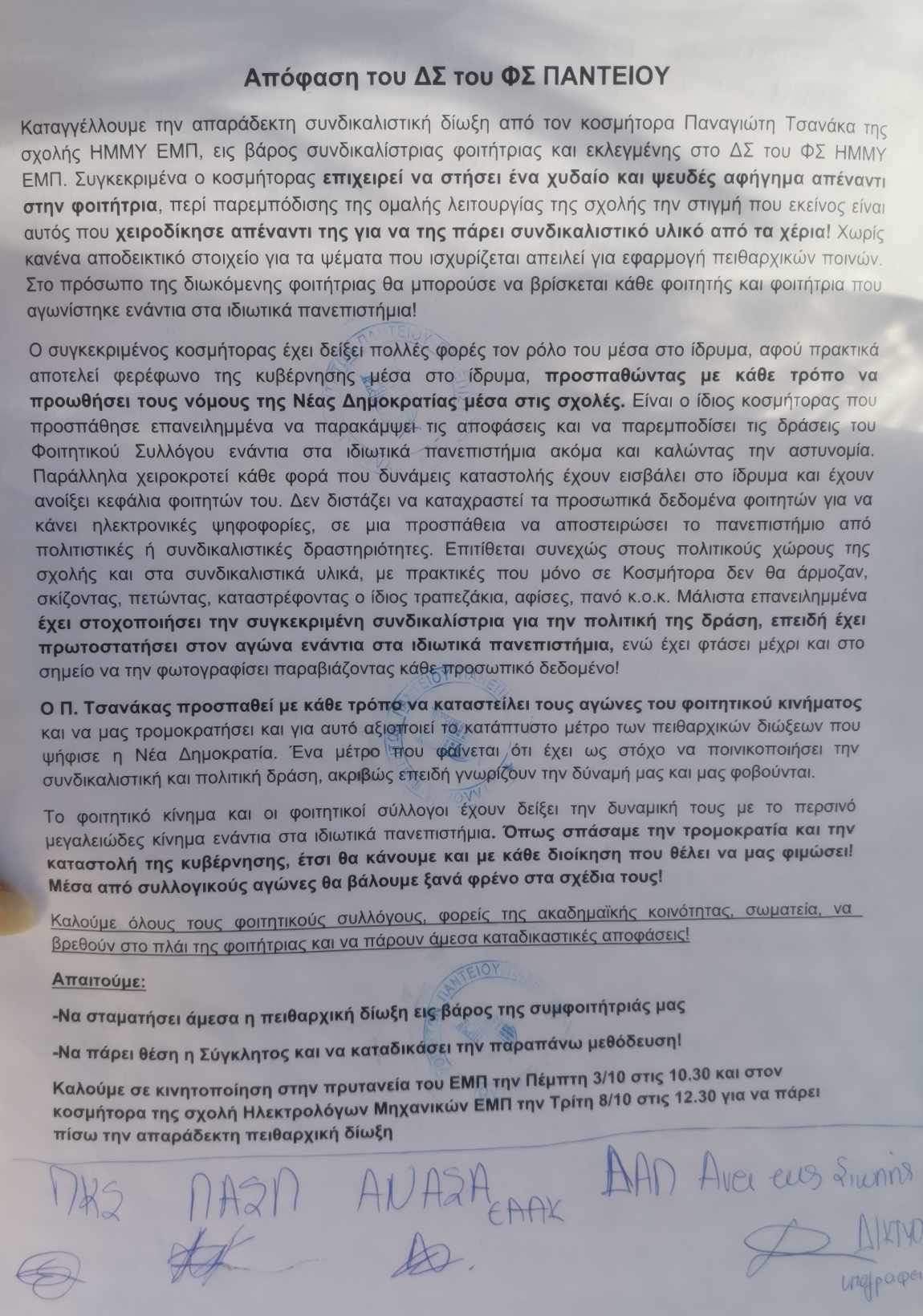 Για παράδειγμα το ψήφισμα του Φοιτητικού Συλλόγου Παντείου Πανεπιστημίου: