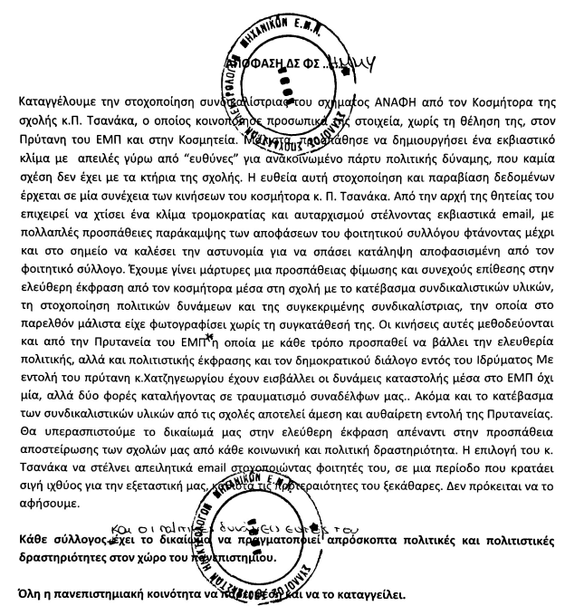 Το ψήφισμα του Φοιτητικού Συλλόγου που καταγγέλλει τον Κοσμήτορα για «εκβιαστικό κλίμα» και «αυταρχική συμπεριφορα»:
