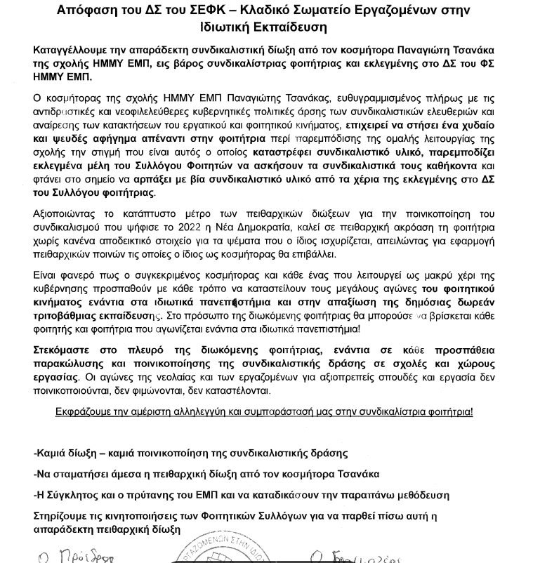 «Ο κοσμήτορας επιχειρεί να στήσει ένα χυδαίο και ψευδές αφήγημα απέναντι στη φοιτήτρια περί  παρεμπόδισης της ομαλής λειτουργίας της σχολής, την στιγμή που είναι αυτός ο οποίος καταστρέφει συνδικαλιστικό υλικό, παρεμποδίζει εκλεγμένα μέλη του συλλόγου φοιτητών να ασκήσουν τα συνδικαλιστικά τους καθήκοντα και φτάνει στο σημείο να αρπάξει με τη βία συνδικαλιστικό υλικό από τα χέρια της εκλεγμένης στο ΔΣ του συλλόγου φοιτήτριας» σημειώνει το Κλασικό Σωματείο Εργαζομένων στην Ιδιωτική Εκπαίδευση, περιγράφοντας ακριβώς την αντιστροφή των γεγονότων από πλευράς του κοσμήτορα.