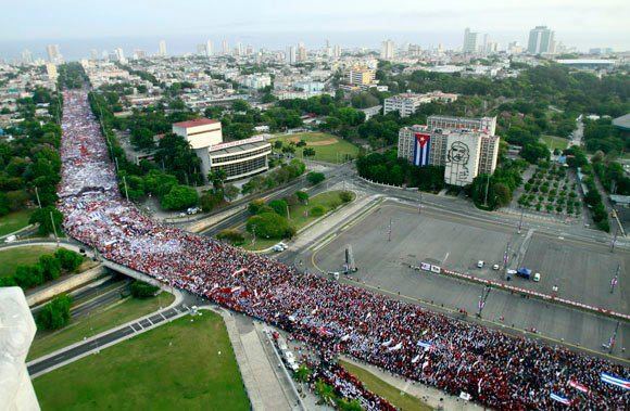 Μία λαοθάλασσα από εργάτες, μεταδίδουν τα ξένα πρακτορεία, πολλοί εκ των οποίων φορούσαν κόκκινα πουκάμισα, όπως αυτά που φέρουν οι οπαδοί του κόμματος του Τσάβες στη Βενεζουέλα και κρατώντας φωτογραφίες του, παρήλασαν μπροστά από το γιγαντιαίο άγαλμα του εθνικού ήρωα της Κούβας Χοσέ Μάρτι, στην αχανή πλατεία όπου διοργανώνονται όλα τα μεγάλα γεγονότα.