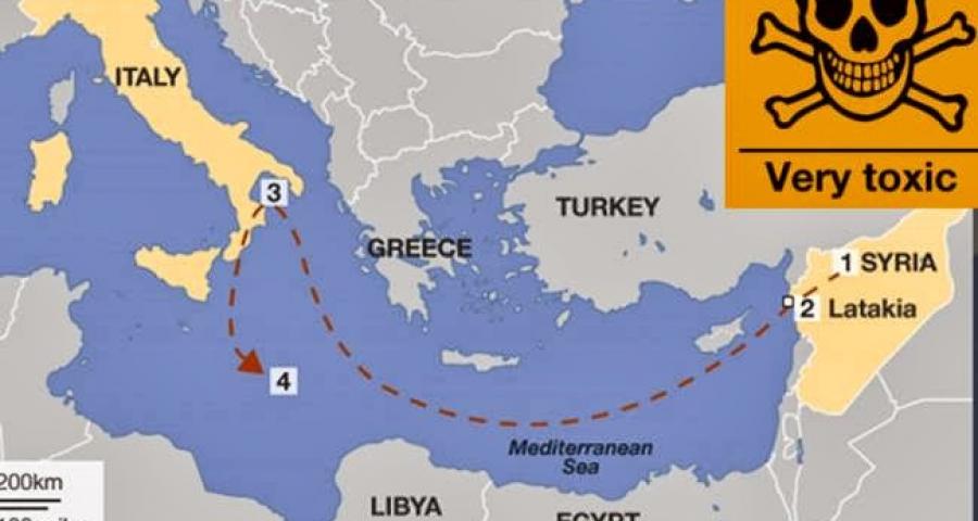 Υπενθυμίζουμε για μια ακόμη φορά ότι απαιτείται από την Ελληνική Κυβέρνηση που σήμερα έχει αναλάβει την Προεδρία της Ευρωπαϊκής Ένωσης: να ασκήσει βέτο κατά της απόφασης αυτής του Οργανισμού για την Απαγόρευση των Χημικών Όπλων (OPCW) να παρέμβει αποτρεπτικά στον Ο.Η.Ε., που έχει τεθεί επικεφαλής για την επίβλεψη της όλης διαδικασίας, συντονίζοντας την παρέμβασή της με τις χώρες που γειτονιάζουν άμεσα με τη θαλάσσια περιοχή όπου θα γίνει η «εξουδετέρωση» (Ιταλία και Μάλτα).