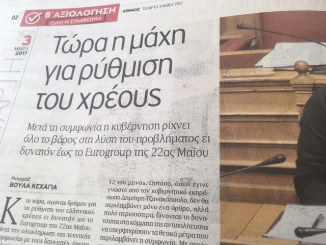 Πώς εξέλαβε τη χθεσινή συμφωνία λοιπόν η καλή εφημερίδα; Ως θρίαμβο. Δείτε μόνο τους τίτλους των ρεπορτάζ του και θα καταλάβετε.