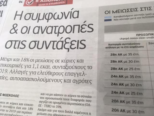 Τη σφαγή στις συντάξεις π.χ. που το TTP παρουσίασε ως «Η συμφωνία “βυθίζει” ακόμα περισσότερο τους συνταξιούχους» το Έθνος την έχει ως «Η συμφωνία και οι ανατροπές στις συντάξεις». Άκου «ανατροπές»; Πάλι καλά που δεν είδε αύξηση και κέρδη…