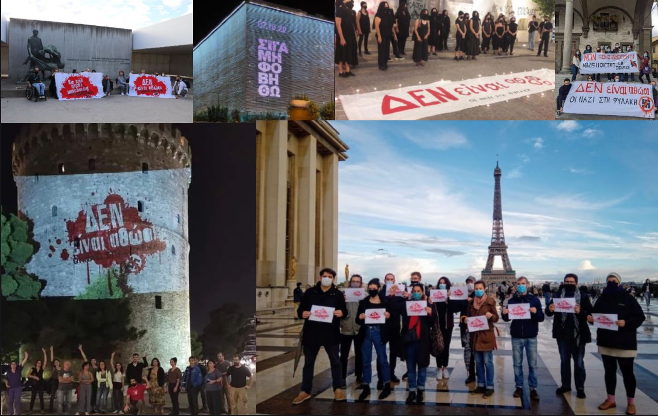 Το κύμα κινητοποίησς έφτασε και σε τμήμα του κτιρίου της Στέγης Ιδρύματος Ωνάση, που το απόγευμα της Κυριακής φωταγωγήθηκε με τον στίχο «Σιγά μη φοβηθώ» του Γιάννη Αγγελάκα, που είχε χρησιμοποιήσει και ο Παύλος Φύσσας