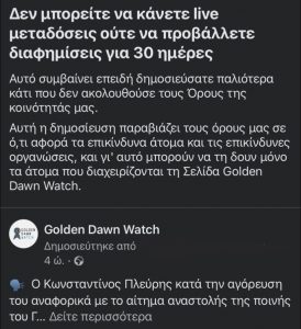 «Με δυσάρεστη έκπληξη πληροφορηθήκαμε ότι επιβλήθηκε ποινή ενός μηνός από το facebook στο Golden Dawn Watch/Παρατηρητήριο στη Δίκη της Χρυσής Αυγής επειδή μετέδωσε φράση που ακούστηκε κατά τη διάρκεια της δίκης, σήμερα 6 Ιουλίου. Επιβλήθηκε δηλαδή ποινή στο Παρατηρητήριο επειδή έκανε αυτό ακριβώς για το οποίο συστήθηκε και λειτουργεί» αναφέρει σε σχετική του ανάρτηση το Παρατηρητήριο και προσθέτει: