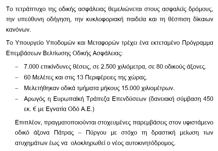 «Πιο ασφαλείς δρόμοι. Είναι τα μεγάλα έργα οδικών υποδομών που ξεμπλοκάρουν ή προγραμματίζονται όπως: Πάτρα-Πύργος, Ε-65, ΒΟΑΚ, Καλαμάτα- Ριζόμυλος, Επεκτάσεις Αττικής Οδού, Flyover στη Θεσσαλονίκη, Ολοκλήρωση του οδικού μας δικτύου με νέους, σύγχρονους, ασφαλείς αυτοκινητόδρομους.