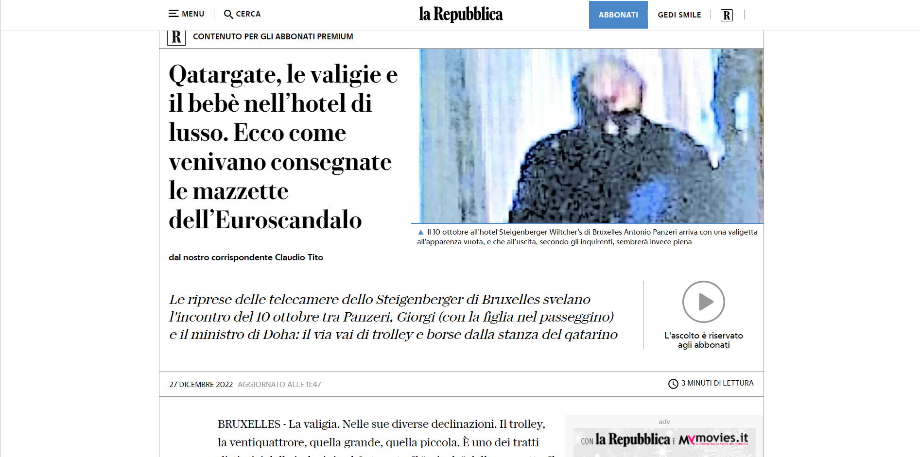 «Περνάει άλλη μια ώρα. Η συνάντηση τελειώνει. Ο Παντσέρι φεύγει από το ξενοδοχείο κρατώντας τον ίδιο χαρτοφύλακα που είχε στην είσοδο. Τώρα, όμως, επισημαίνεται από την Εισαγγελία με έναν ωραίο κόκκινο κύκλο. Γιατί; “Φαίνεται πιο γεμάτο”, γράφει η εισαγγελία των Βρυξελλών. Η υποψία των δικαστών, εν ολίγοις, είναι ότι αυτή ήταν μία από τις συναντήσεις όπου οργανώθηκε η παράδοση μετρητών. Από ένα καροτσάκι σε έναν χαρτοφύλακα. Ένα δοκιμασμένο σύστημα. (..) Διότι, όπως έχουν γράψει επανειλημμένα οι εισαγγελείς των Βρυξελλών, “στόχος της κλίκας ήταν το “argent”. Τα χρήματα» σημειώνει η La Repubblica.