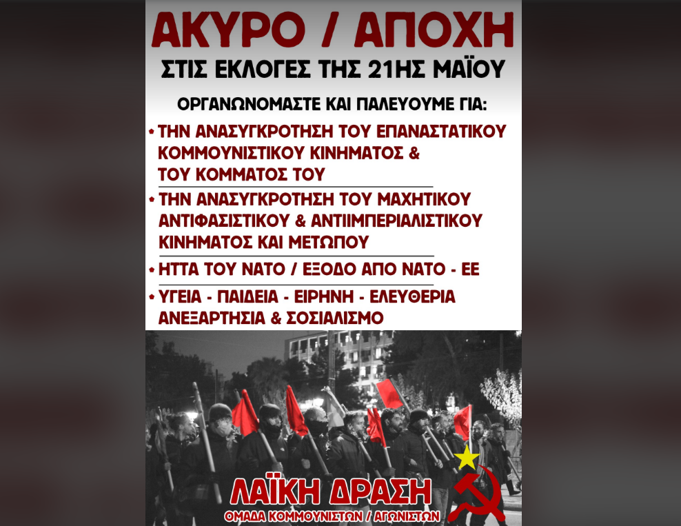 «Στις εκλογές της 21ης Μάη κάνουμε ΑΚΥΡΟ – ΑΠΟΧΗ. Αγωνιζόμαστε για την ανασυγκρότηση του Επαναστατικού Κομμουνιστικού Κινήματος και του Κόμματός του. Για ένα κόσμο στο μπόι των ονείρων μας, στο μπόι των ανθρώπων