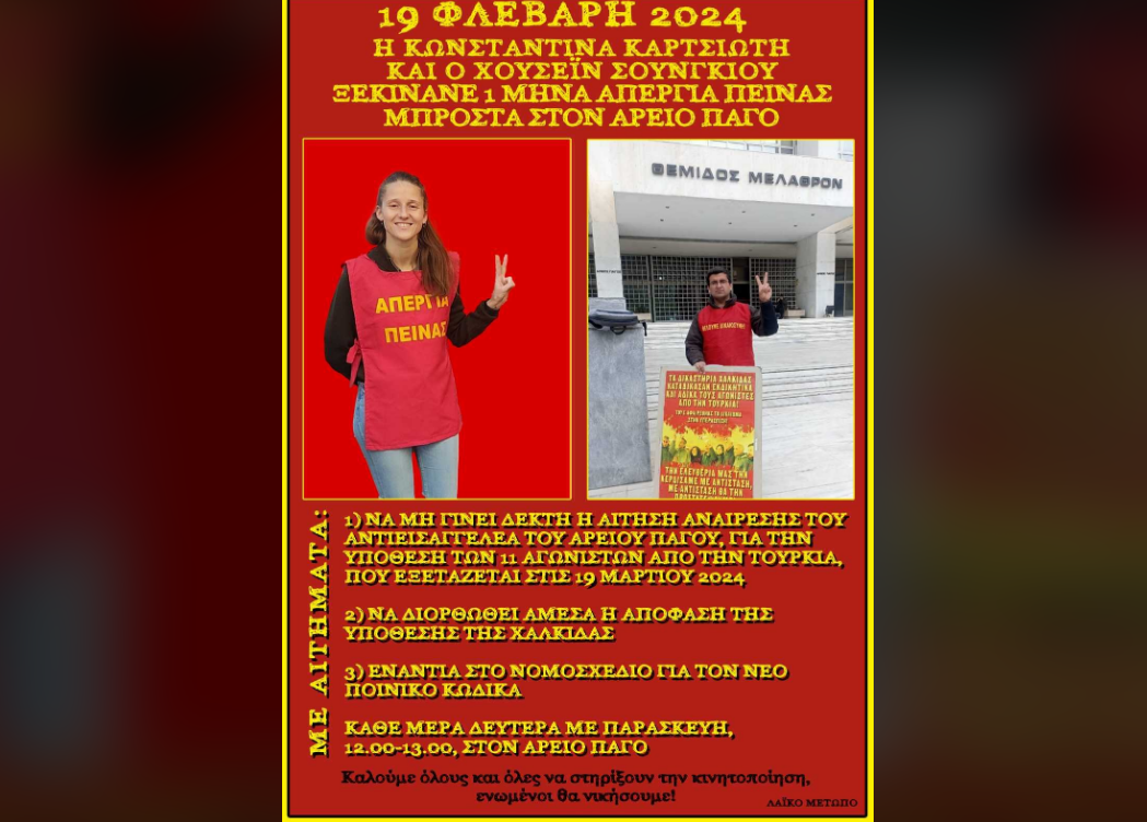 «Απέναντι στη νομική τρομοκρατία ιμπεριαλισμού και ελληνικού κράτους η Κωνσταντίνα Καρτσιώτη και ο Χουσεϊν Σουνκιού θα ξεκινήσουν απεργία πείνας από τις 19 Φλεβάρη για ένα μήνα μπροστά στον Άρειο Πάγο. Η επίθεσεις στους αγωνιστές, αποτελούν κομμάτι της συνολικής νομικής τρομοκρατίας που θέλουν να επιβάλλουν ο ιμπεριαλισμός και τα αστικά κράτη. Κομμάτι της ίδιας ταξικής επίθεσης αποτελεί και το νομοσχέδιο για το νέο ποινικό κώδικα, όπου πρόκειται για σκληρή αναβάθμιση του νομικού οπλοστασίου του συστήματος.