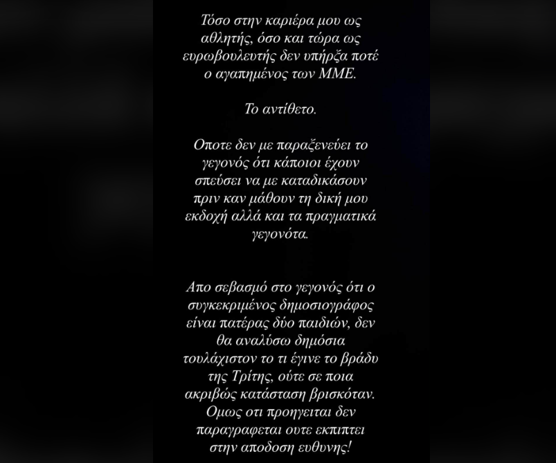 «Από σεβασμό στο γεγονός ότι ο συγκεκριμένος δημοσιογράφος είναι πατέρας δύο παιδιών, δεν θα αναλύσω δημόσια τουλάχιστον το τι έγινε το βράδυ της Τρίτης, ούτε σε ποια ακριβώς κατάσταση βρισκόταν» συνεχίζει με μία σχετικά άσχετη αναφορά στα παιδιά του δημοσιογράφου. «Όμως ό,τι προηγήθηκε δεν παραγράφεται ούτε εκπίπτει στην απόδοση ευθύνης!» προσθέτει με νόημα.