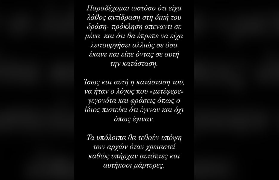 «Παραδέχομαι ωστόσο ότι είχα λάθος αντίδραση στη δική του δράση – πρόκληση απέναντι σε μένα και ότι θα έπρεπε να είχα λειτουργήσει αλλιώς σε όσα έκανε και είπε όντας σε αυτή την κατάσταση.