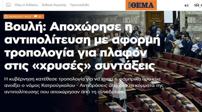 Πάντως, άμα είσαι χειροκροτητής ή έχεις όρεξη να χωθείς στην άμμο, έχεις έναν πολύτιμο σύμμαχο: Τα συστημικά ΜΜΕ, που ήδη δίνουν τα διαπιστευτήριά τους στη νέα κυβέρνηση.  To «Πρώτο Θέμα» για παράδειγμα, έγραφε το βράδυ της Πέμπτης ότι η αντιπολίτευση αποχώρησε «με αφορμή τροπολογία για πλαφόν στις “χρυσές”» συντάξεις, ενώ οι απαράδεκτες κινήσεις Βρούτση και το περιεχόμενο της τροπολογίας για τα εργασιακά πέρασαν στα ψιλά για το μεγαλύτερο μέρος των μέσων. Για κάποιους αυτό το μοντέλο «δημοσιογραφίας» μοιάζει αναμενόμενο, γνώριμο και αυτονόητο, αλλά θα πρέπει να στηλιτεύεται ξανά και ξανά. Η δεξιά παλινόρθωση άλλωστε, είναι πολιτική, κοινωνική, αλλά και μιντιακή.