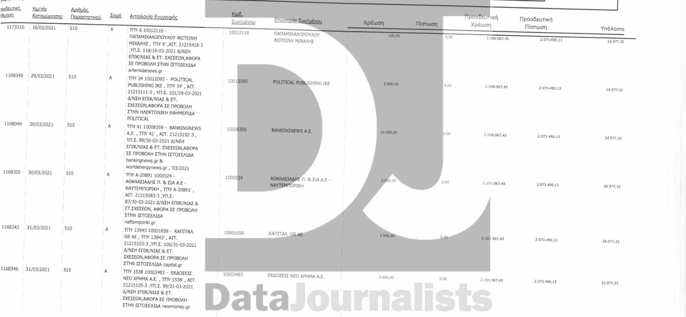 Ειδικότερα, περισσότερα χρήματα έχουν λάβει οι ιστοσελίδες Mononews (45.000 ευρώ), και ο όμιλος DPG (newsbomb, CNN κ.α.) με 43.000 ευρώ. Επιπλέον, το Political και το Liberal έλαβαν 39.000 ευρώ. Το protothema.gr, το οποίο έχει υψηλή επισκεψιμότητα, φέρεται να έλαβε 12.000 ευρώ, το zougla.gr 8.500 ευρώ, και το ethnos.gr μόλις 2.500 ευρώ. Σύμφωνα με τους Data Journalists στις ίδιες λίστες εντοπίστηκε η συνδρομητική επιχειρηματική ιστοσελίδα, το bnbdaily.gr η οποία φέρεται να έλαβε 28.200 ευρώ και την ίδια στιγμή το newsit.gr δεν ξεπέρασε τις 20.000 και το ieidiseis.gr τα 1.000 ευρώ.