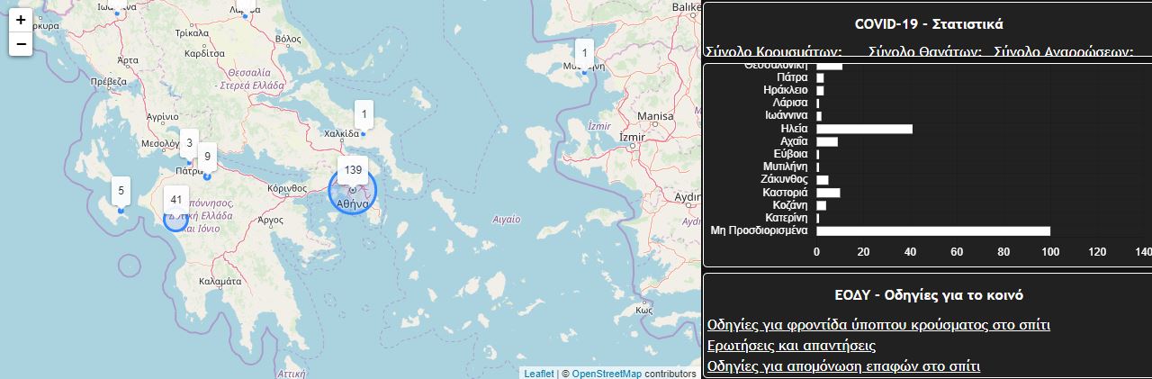 Επίσης, υπάρχει γράφημα με κρούσματα ανά περιοχή της χώρας και κάποια χρήσιμα links με οδηγίες για το κοινό από τον ΕΟΔΥ.
