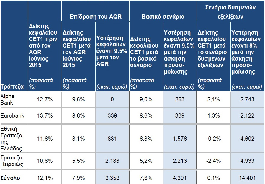 Συνολικές ανάγκες 14,4 δισ ευρώ ανέδειξαν τα τεστ αντοχής της ΕΚΤ για τις ελληνικές τράπεζες. Στην χειρότερη θέση η Τράπεζα Πειραιώς και η Εθνική Τράπεζα. Σε καλύτερη θέση η Alpha Bank και η Eurobank. Το ThePressProject και το MarketFair συνεργάζονται για την ζωντανή μετάδοση των αποτελεσμάτων.