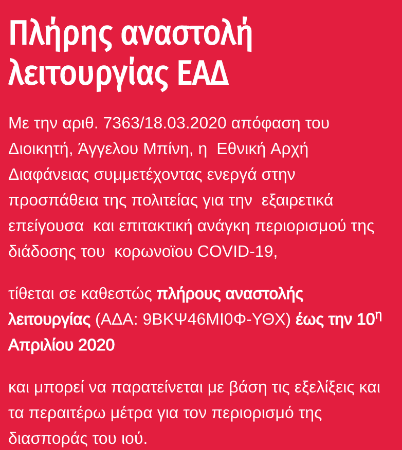Για την ακρίβεια, η ΕΑΔ ανακοίνωσε από την περασμένη Τετάρτη με ανακοίνωσή της την πλήρη αναστολή λειτουργίας της, τονίζοντας πως «ε την αριθ. 7363/18.03.2020 απόφαση του Διοικητή, Άγγελου Μπίνη, η Εθνική Αρχή Διαφάνειας συμμετέχοντας ενεργά στην προσπάθεια της πολιτείας για την εξαιρετικά επείγουσα και επιτακτική ανάγκη περιορισμού της διάδοσης του κορονοϊου COVID-19, τίθεται σε καθεστώς πλήρους αναστολής λειτουργίας (ΑΔΑ: 9ΒΚΨ46ΜΙ0Φ-ΥΘΧ) έως την 10η Απριλίου 2020».