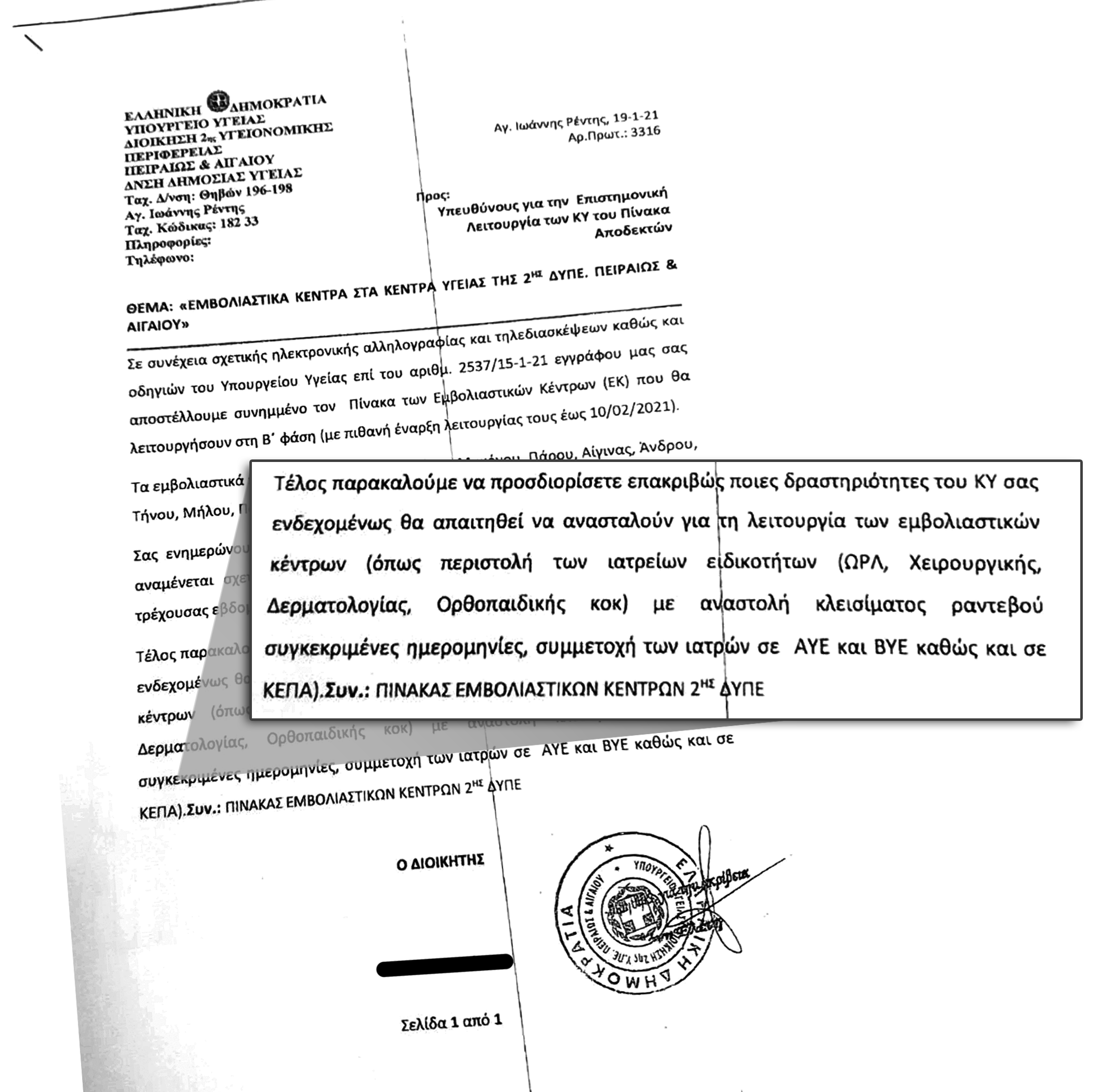 Σύμφωνα με έγγραφο της 2ης Υγειονομικής Περιφέρειας που αποκάλυψε ο «Ριζοσπάστης», ζητείται από τα Κέντρα Υγείας να προσδιορίσουν ποιες από τις δραστηριότητές τους θα ανασταλούν για τη λειτουργία των εμβολιαστικών κέντρων. Συγκεκριμένα, ζητείται από τους υπευθύνους για την επιστημονική λειτουργία των Κέντρων Υγείας «να προσδιορίσετε επακριβώς ποιες δραστηριότητες του ΚΥ σας ενδεχομένως θα απαιτηθεί να ανασταλούν για τη λειτουργία των εμβολιαστικών κέντρων (όπως περιστολή των ιατρείων ειδικοτήτων [ΩΡΛ, χειρουργικής, δερματολογίας, ορθοπαιδικής κ.ο.κ.] με αναστολή κλεισίματος ραντεβού συγκεκριμένες ημερομηνίες, συμμετοχή των ιατρών σε ΑΥΕ και ΒΥΕ καθώς και σε ΚΕΠΑ)».