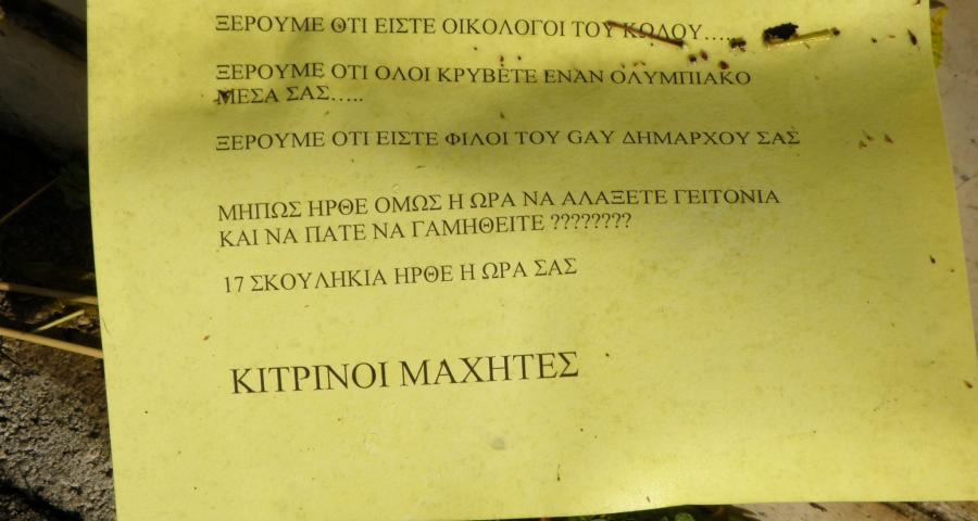 Το …σημείωμα που βλέπετε στην φωτογραφία ανακάλυψαν το Σάββατο (6/12) το πρωί, μπροστά στις πόρτες των σπιτιών τους και οι 17 δημότες της Νέας Φιλαδέλφειας, που έχουν καταθέσει αίτηση ακύρωσης της απόφασης για την επέκταση και ανακατασκευή -από εταιρία του ιδιοκτήτη της ΠΑΕ ΑΕΚ, Γιάννη Μελισσανίδη- του γηπέδου της ΑΕΚ.