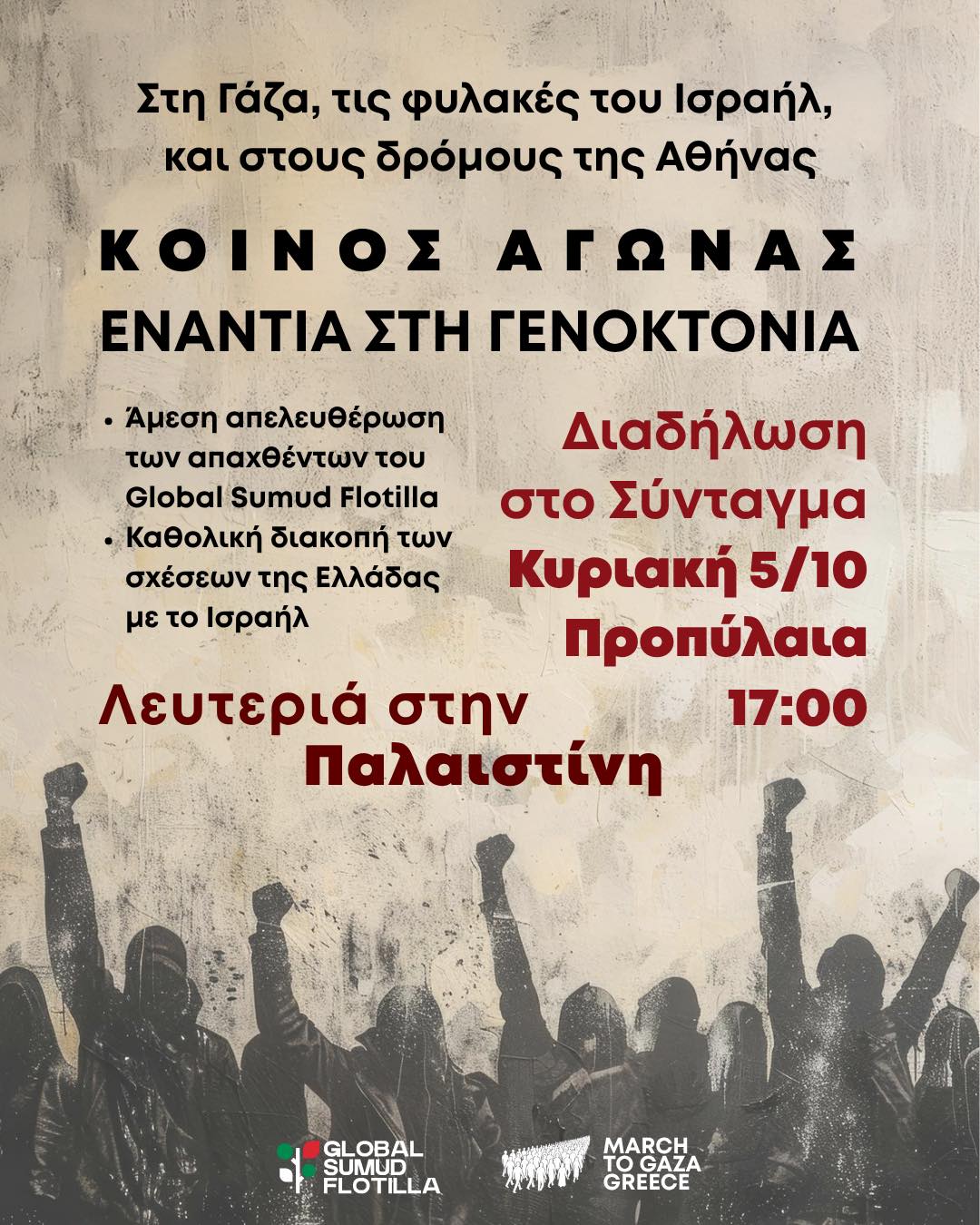 Με αιτήματα την άμεση απελευθέρωση των απαχθέντων του Global Sumud Flotilla, την καθολική διακοπή των σχέσεων της Ελλάδας με το Ισραήλ και λευτεριά στην Παλαιστίνη καλεί η οργάνωση March to Gaza Greece, σήμερα, Κυριακή 5/10, σε συγκέντρωση στα Προπύλαια.