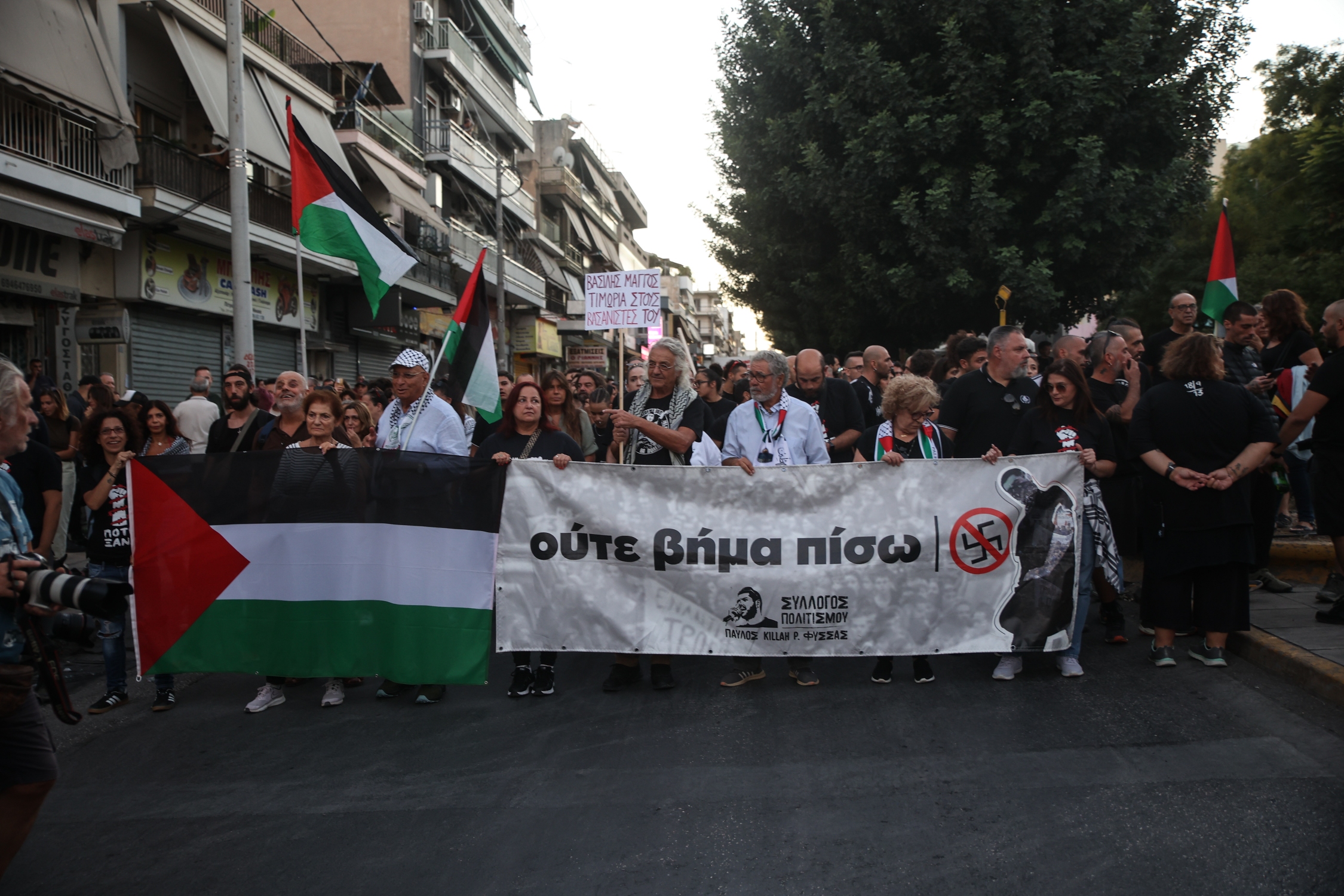 The day began with flowers laid at Fyssas’ monument in Keratsini. His mother, Magda Fyssa, visibly moved, caressed and kissed the relief of her son before leading the march. Wearing a Palestinian scarf and holding a banner that read “Not a step back”, she addressed the crowd: