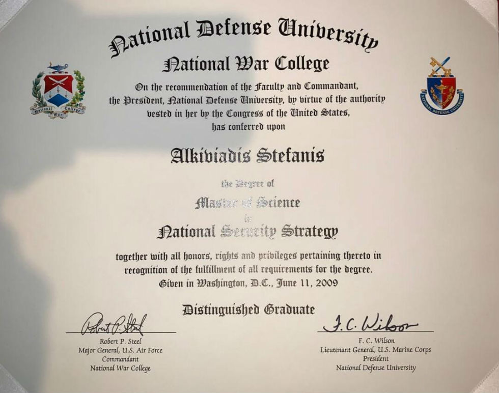- Ποιο ήταν το αντικείμενο του δεύτερου μεταπτυχιακού του που φέρεται να απέκτησε στις ΗΠΑ; «Στρατηγικές Ασφαλείας» (όπως αναφέρεται στο βιογραφικό του στο ΥΠΕΘΑ) ή «Στρατηγική Εθνικής Ασφάλειας» (όπως αναφέρεται στο βιογραφικό του στη Διπλωματική Υπηρεσία της Ε.Ε.); Επίσης, τι είδους τίτλο απέκτησε εκεί: ΜΒΑ, ΜSc, M.A. ή ένα απλό πιστοποιητικό παρακολούθησης;