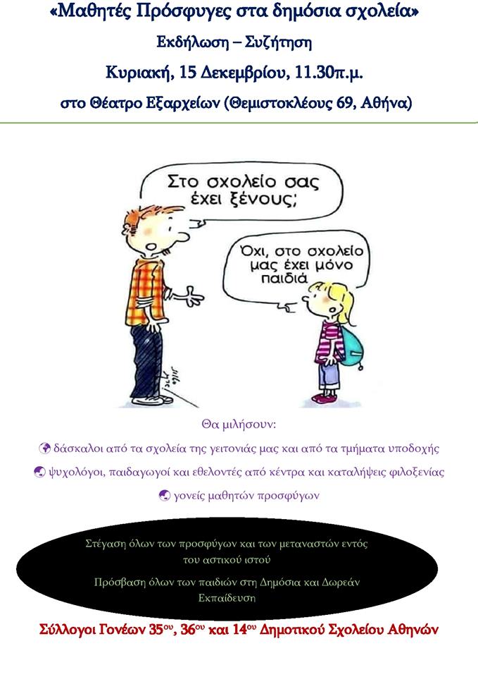 «…Θέλουμε τους συμμαθητές των παιδιών μας πίσω. Γιατί είναι υποχρέωσή όλων μας να εξασφαλιστεί επιτέλους για αυτούς ένα ασφαλές περιβάλλον. Γιατί χάρη σε αυτούς πολλά από τα σχολεία του κέντρου έμειναν ανοιχτά. Γιατί δεν είναι δυνατόν πολιτικά παιχνίδια να παίζονται πάνω στις πλάτες παιδιών και κατατρεγμένων ανθρώπων», έγραφε η κοινή ανακοίνωση των Συλλόγων του 35ου και 36ου δημοτικού σχολείου Αθηνών, τοποθετώντας τη συζήτηση σε πραγματική βάση.
