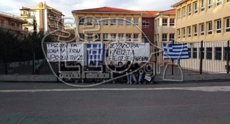 Δύο από τα πανό που ανήρτησαν έξω από το σχολείο τους γράφουν: «Τρίζουν τα κόκκαλα των ηρώων του 21», «Σύνορα κλειστά, έλεος σε κανέναν».