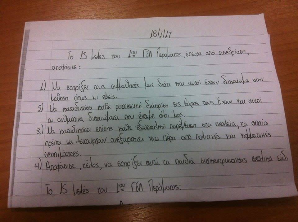 Αυτή είναι η απόφαση του 15μελούς του 1ου ΓΕΛ Περάματος όπως κατατέθηκε στο Δημοτικό Συμβούλιο της πόλης.Οι μαθητές απαντάνε στις ρατσιστικές κραυγές που παρουσιάστηκαν στην περιοχή την Τρίτη μετά από την εισβολή ομάδας δεκάδων χρυσαυγιτών, με επικεφαλής τον υπόδικο βουλευτή Γιάννη Λαγό, εισέβαλε σε δημοτικό σχολείο του Περάματος που επρόκειτο να φοιτήσουν προσφυγόπουλα.
