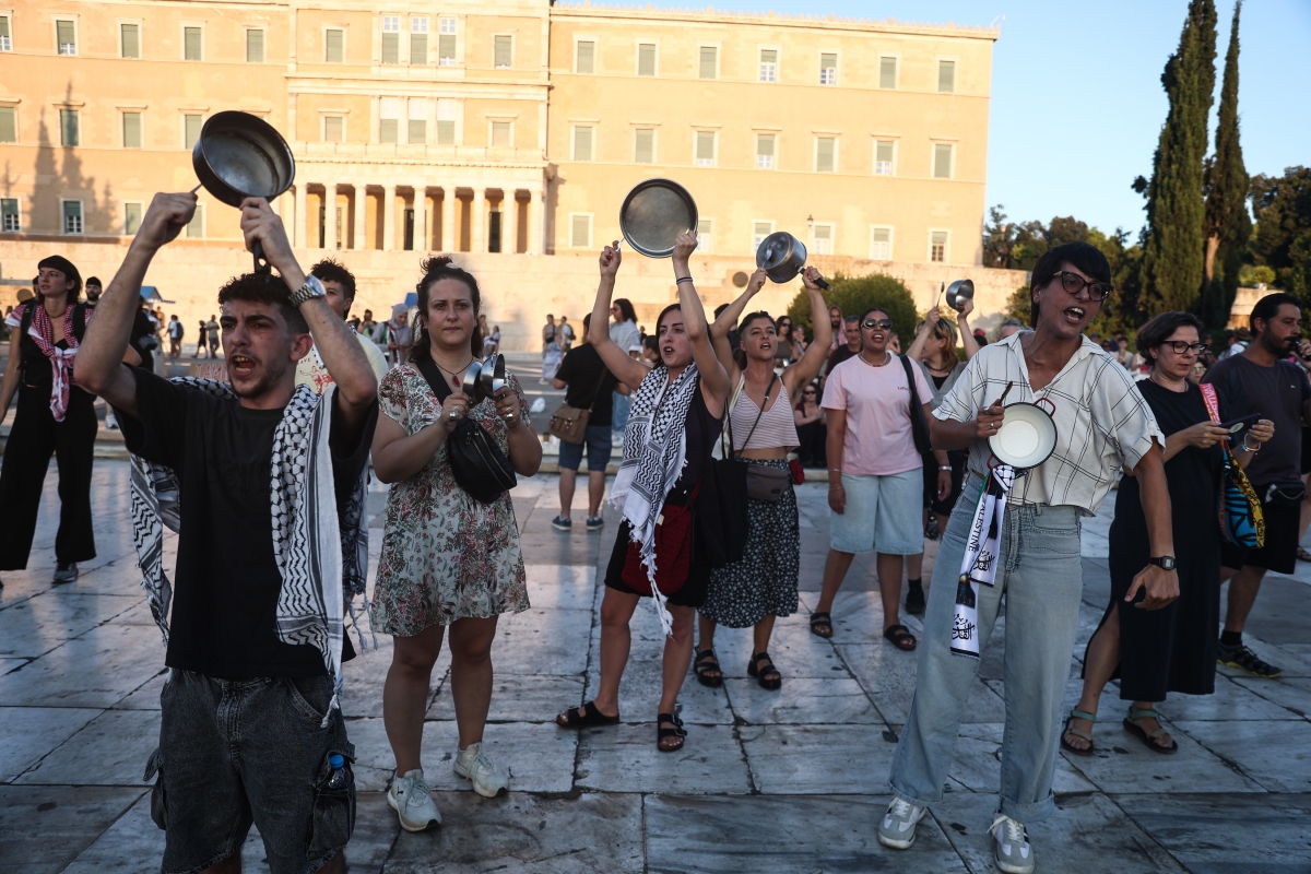 Κρατώντας κατσαρόλες, μπρίκια, κουτάλες και κάθε είδους κουζινικό σκεύος, θέλωντας να τονίσουν τον τεχνητό λιμό που επιβάλλει το Ισραήλ στη Γάζα, δήλωσαν δεν θα ανεχτούν άλλο την συνενοχή της χώρας τους στο μεγαλύτερο έγκλημα των καιρών μας, την γενοκτονία του Παλαιστινιακού λαού.