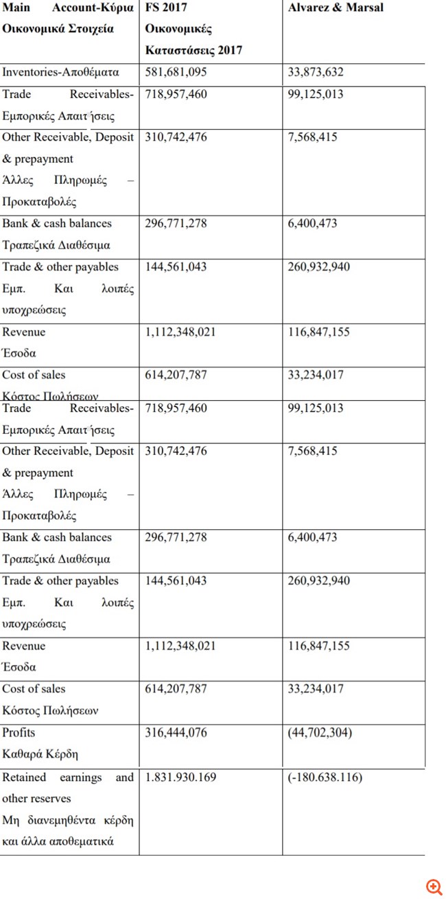 Σημειώνεται ότι πριν 2 χρόνια η συμβουλευτική εταιρεία Alvarez & Marsal είχε συντάξει έκθεση στην οποία αποτυπωνόνταν οι αποκλίσεις μεταξύ των οικονομικών καταστάσεων του 2017 της εταιρείας και των στοιχείων που προέκυψαν από τον έλεγχο της A&M – αποκλίσεις που ήταν χαώδεις.