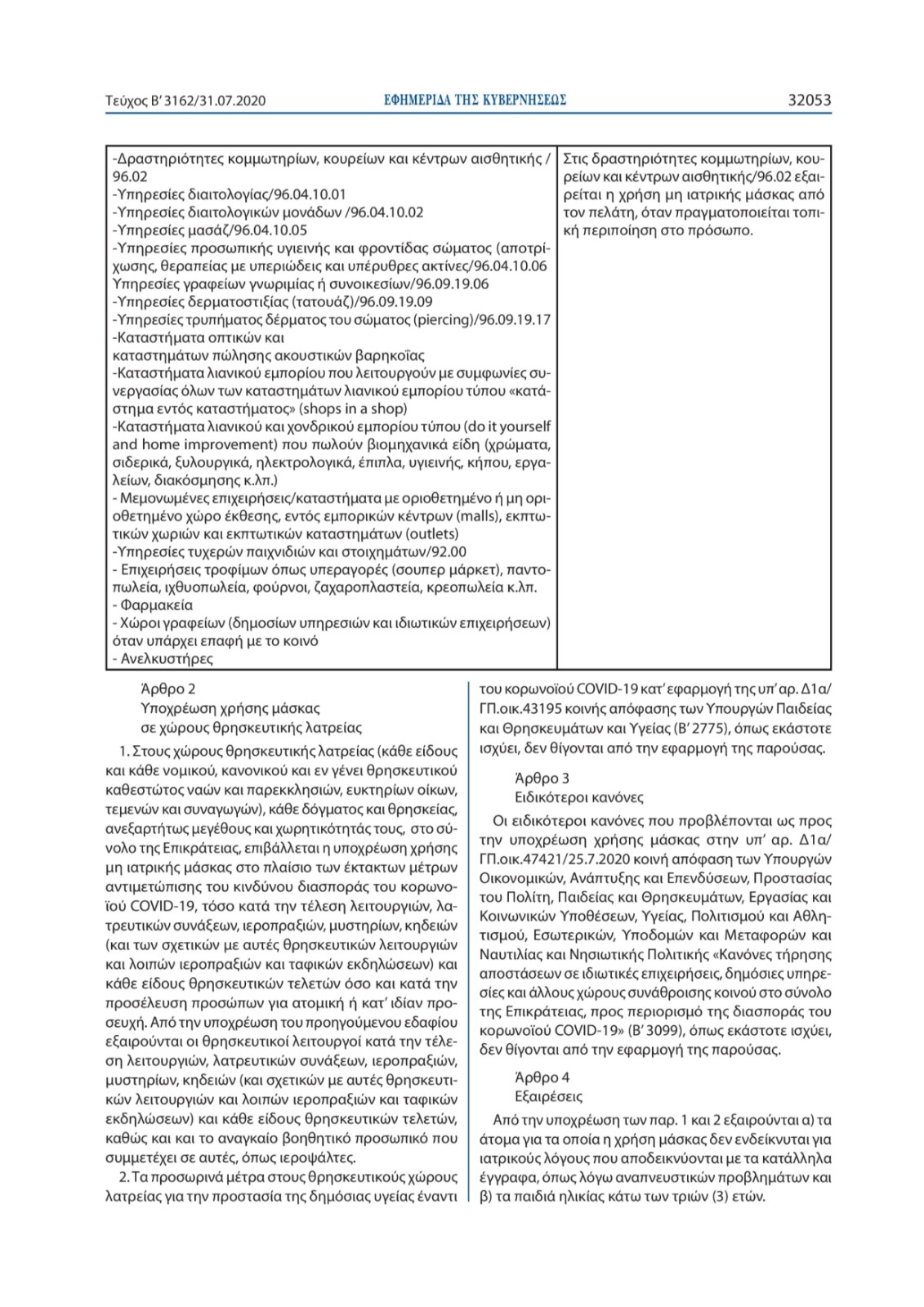 Ωστόσο, η Κοινή Υπουργική Απόφαση που δημοσιεύτηκε στο Φύλλο Εφημερίδας της Κυβέρνησης αναφέρει ξεκάθαρα πως από την υποχρέωση χρήσης μάσκας σε κλειστούς χώρους εξαιρούνται οι θρησκευτικοί λειτουργοί, μόνον όμως κατά τη διάρκεια της τέλεσης θρησκευτικών λειτουργιών και τελετών.