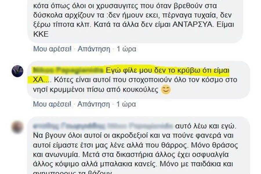 Κοινοποιούμε τρεις από τις πολλές δημόσιες αναρτήσεις του κυρίου αυτού και αναμένουμε από την οργάνωση της Νέας Δημοκρατίας να δηλώσει δημόσια αν ο «νταής» είναι μέλος του κόμματος αλλά και ποια είναι η άποψή τΗς για τις επιλεκτικές σχέσεις του με τον Χρυσαυγίτη.