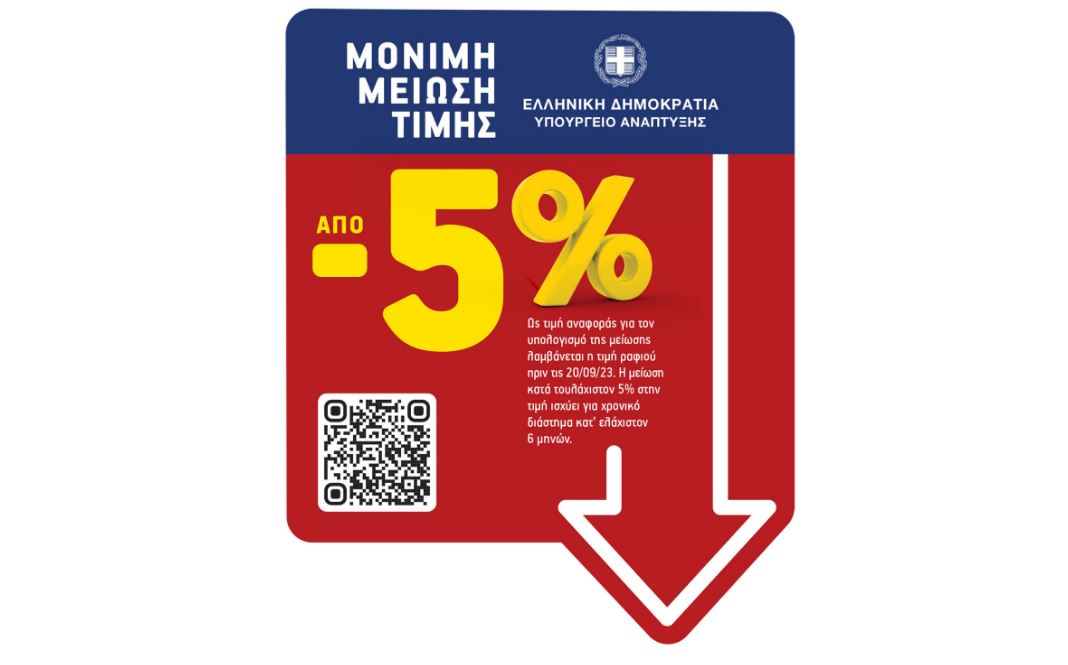 - – Οι επιχειρήσεις παραγωγής ή χονδρικής εμπορίας καταναλωτικών προϊόντων που θα συμμετέχουν στην πρωτοβουλία «Μόνιμη Μείωση Τιμής» θα πρέπει να αποστείλουν μέχρι τις 30 Νοεμβρίου 2023 την έγγραφη δέσμευση στο Υπουργείο Ανάπτυξης. Ως τιμή αναφοράς για τον υπολογισμό της μείωσης θα λαμβάνεται η τιμή ραφιού στις 19/9/23.
