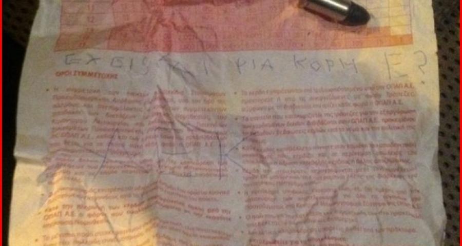 Την Τρίτη 3 Ιούνη, ο κάτοικος (το όνομά του είναι στη διάθεση της εφημερίδας Κόντρα) επέστρεφε στο σπίτι του, όταν στο παρμπρίζ του αυτοκινήτου του βρήκε ένα διπλωμένο χαρτί από κουπόνι του Στοιχήματος. Το ξεδίπλωσε και με έκπληξη είδε τη σφαίρα να κυλά στα πόδια του!