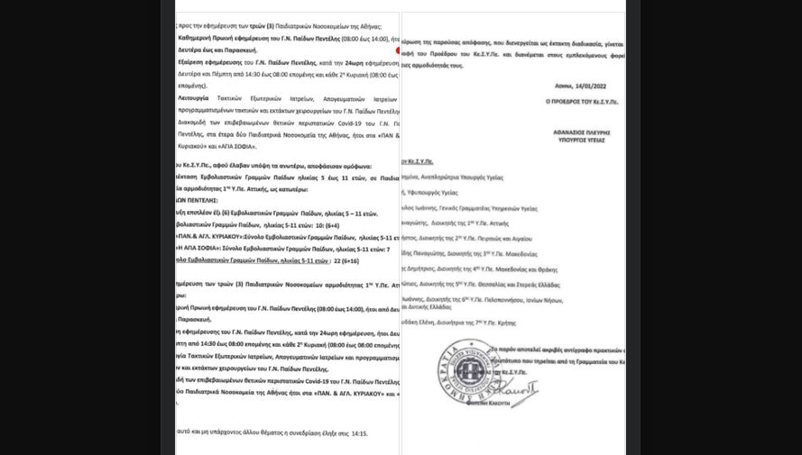 Με έγγραφο που φέρει την υπογραφή του Θάνου Πλεύρη και της Μίνας Γκάγκα επικυρώνεται η απόσυρση του νοσοκομείου «Παίδων Πεντέλης» από την 24ωρη γενική εφημερία με πρόσχημα τον εμβολιασμό.