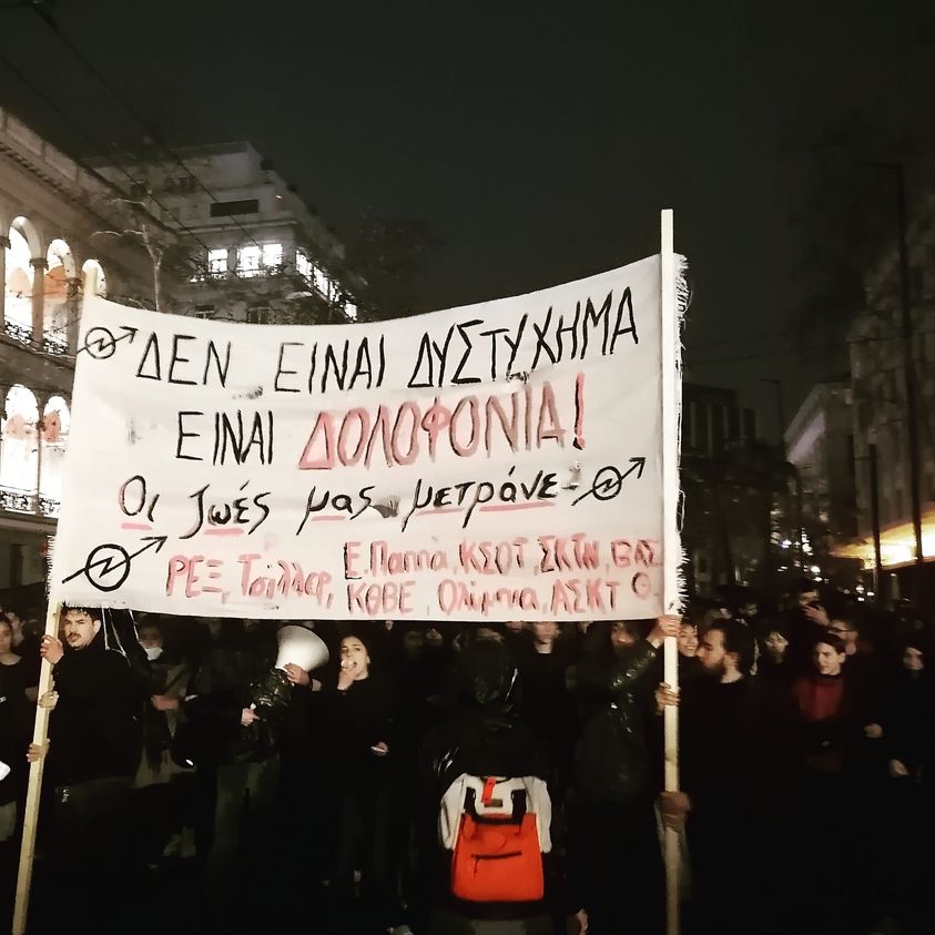 Της πορείας προπορεύονται οι καλλιτέχνες, που φώναξαν έξω από την κατάληψη του Ρεξ συνθήματα όπως «δέκα, εκατό, χιλιάχες καταλήψεις, ενάντια σε έναν κόσμο οργανωμένης σήψης». Μπροστά βρίσκονται οι μαριονέτες με χαρακτηριστική εκείνη του χάρου, που συμβολίζει τα παιδιά που σκοτώθηκαν.