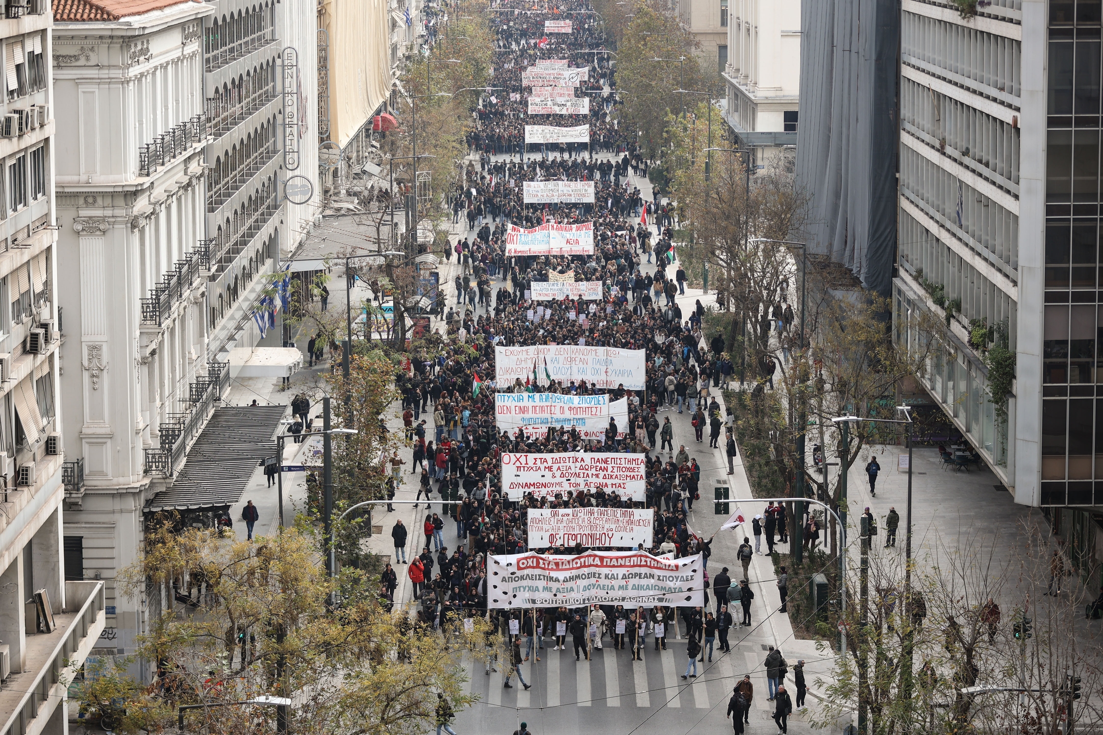 Οι φοιτητές, μαθητές και εκπαιδευτικοί συγκεντρώθηκαν το μεσημέρι στα Προπύλαια και πραγματοποίησαν μεγάλη διαδήλωση προς τη Βουλή. «Όχι στα ιδιωτικά πανεπιστήμια, αποκλειστικά δημόσιες και δωρεάν σπουδές, πτυχία με αξία, δουλειά με δικαιώματα» αναφέρει το πανό των Φοιτητικών Συλλόγων Αθήνας. Στη κινητοποίηση συμμετείχαν επίσης διαδηλωτές, οι οποίοι έφεραν πλακάτ για τις εξωσεις, καθώς και παλαιστινιακες σημαίες.