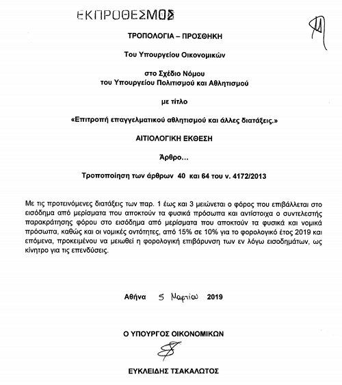 Η τροπολογία κατατέθηκε στο νομοσχέδιο του υπουργείου Πολιτισμού και Αθλητισμού για την Επιτροπή Επαγγελματικού Αθλητισμού και η ρύθμιση ισχύει για τα εισοδήματα που αποκτώνται από 1/1/2019.