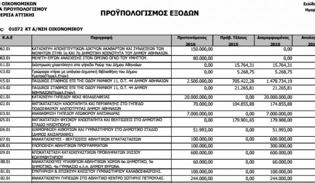 Το προσχέδιο του προϋπολογισμού της Περιφέρειας Αττικής που έχει στην κατοχή του το ThePressProject έχει ήδη εγκριθεί από την Οικονομική Επιτροπή και αναμένεται να τεθεί στο Περιφερειακό Συμβούλιο μέσα στον Δεκέμβριο, αν και η ακριβής ημερομηνία παραμένει άγνωστη. Στη σελίδα 14 του αναλυτικού προϋπολογισμού εξόδων ανά Περιφερειακή Ενότητα είναι τα σημεία που ξεχωρίζουν: Η επιχορήγηση 20 εκατ. ευρώ για την «Κατασκευή γηπέδου Νέας Φιλαδέλφειας» και λίγο πιο κάτω, τα 7 εκατ. ευρώ για την «Αναβάθμιση γηπέδου Λεωφόρου Αλεξάνδρας». Πρόκειται για τις δύο πιο μεγάλες «επενδύσεις» που σχεδιάζει να υλοποιήσει η Περιφέρεια Αττικής μέσα στο 2016 και καλύπτουν το 10% των συνολικών προβλεπόμενων επενδύσεων (278 εκατ.) της μεγαλύτερης Περιφέρειας της χώρας με 5 εκατ. κατοίκους και το 30% περίπου των επενδύσεων που πρόκειται να γίνουν στην Περιφερειακή Ενότητα Κεντρικού Τομέα Αθηνών.
