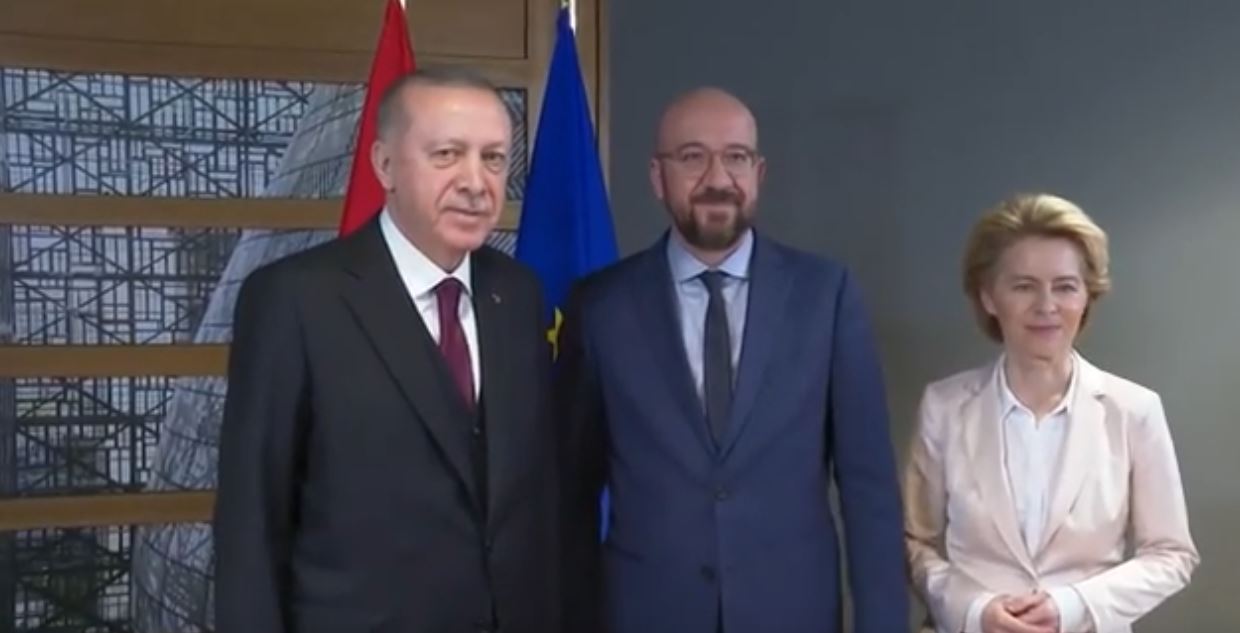 Την ίδια ώρα, ο Ρετζέπ Ταγίπ Ερντογάν αποχώρησε εσπευσμένα από το Ευρωπαϊκό Συμβούλιο, παρότι προβλεπόταν να συμμετάσχει σε συνέντευξη Τύπου, ενώ δεν κράτησε την ίδια στάση μετά τη συνάντησή του με τον επικεφαλής του ΝΑΤΟ. Σύμφωνα με το Γαλλικό Πρακτορείο, ο Ερντογάν εμφανίστηκε ενοχλημένος που, «αντί να ακουστούν οι ανησυχίες του», φον ντερ Λάιεν και Μισέλ υποστήριξαν την Ελλάδα ως «ασπίδα» της Ευρώπης απέναντι στους μετανάστες που ενθαρρύνει η Τουρκία. Επίσης, κατά τις ίδιες πληροφορίες, καταφέρθηκε εναντίον του Κυριάκου Μητσοτάκη.