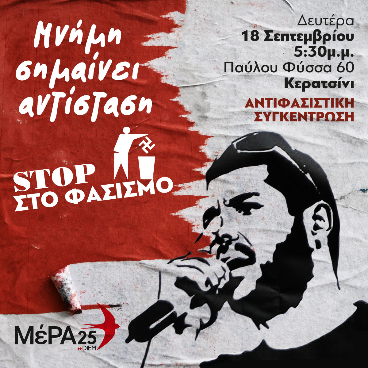Ως ΜέΡΑ25 καλούμε, όλες και όλους, τη Δευτέρα 18 Σεπτεμβρίου, στις 5:30μ.μ. στο μνημείο του Παύλου Φύσσα στο Κερατσίνι, στην Αντιφασιστική Διαδήλωση με πορεία προς το Μπλόκο της Κοκκινιάς.
