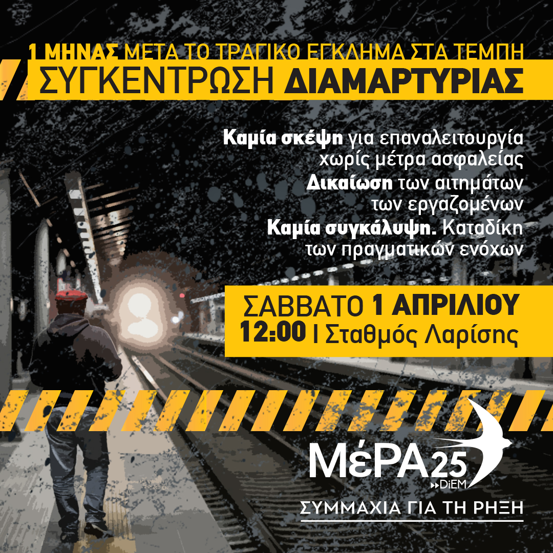 «Σύμφωνα με τις τελευταίες ανακοινώσεις η Κυβέρνηση σκοπεύει να θέσει σε επαναλειτουργία τους σιδηροδρόμους και την γραμμή Αθήνα-Θεσσαλονίκη, το Σάββατο 1 Απριλίου. Παρότι οι εργαζόμενοι έχουν εκφράσει τις διαφωνίες τους και τις ανησυχίες τους, αφού δεν έχει προκύψει καμία πρόβλεψη και αναβάθμιση του δικτύου ώστε να είναι ασφαλής για χρήση, η Κυβέρνηση προχωράει στην επανέναρξη και ταυτόχρονα επιρρίπτει τις ευθύνες του τραγικού δυστυχήματος στους εργαζόμενους και σε ατομικά λάθη», αναφέρει το ΜέΡΑ25.