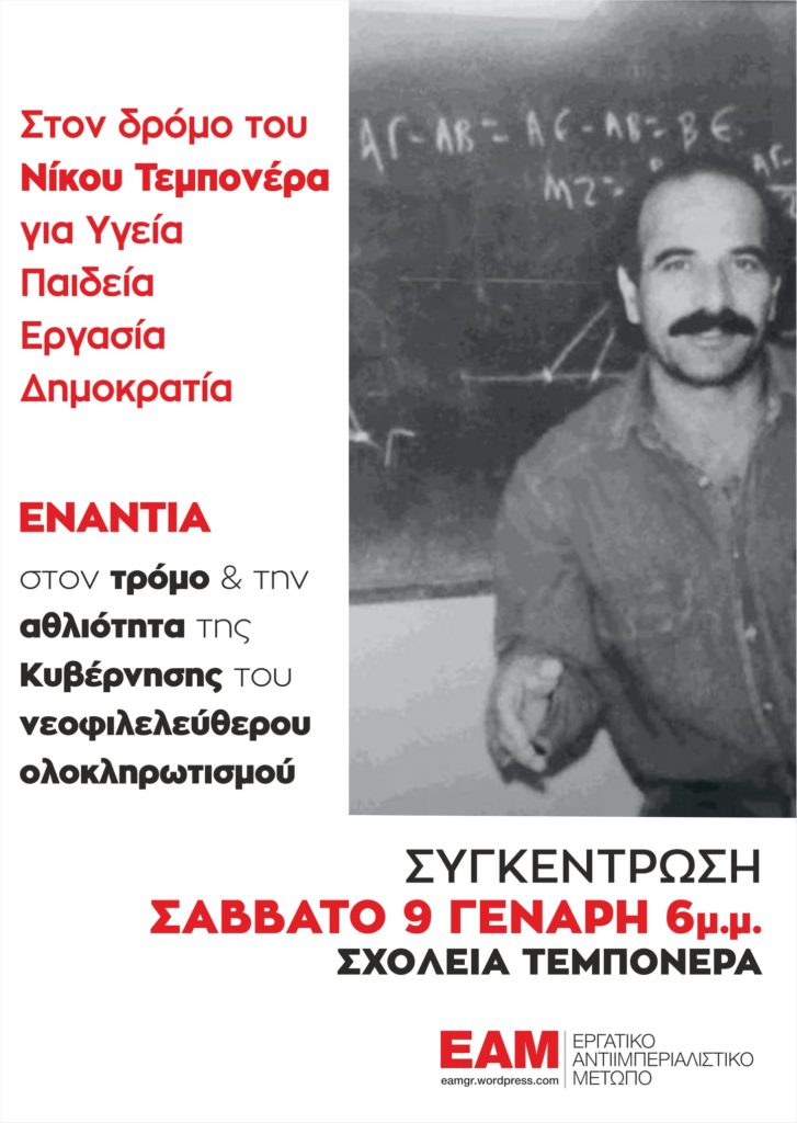 Συμπληρώνονται φέτος 30 χρόνια, από την δολοφονία του λαϊκού αγωνιστή, αριστερού, μαθηματικού, Νίκου Τεμπονέρα. Τριάντα χρόνια, από την ημέρα, που τα φονικά, φασιστικά λοστάρια της Δεξιάς, ανέλαβαν να κάνουν την «βρώμικη δουλειά», εκ μέρους των «πολιτικών αυτουργών», της κυβέρνησης της Νέας Δημοκρατίας, που ήθελαν να ντύσουν το σχολείο και συνεπώς όλη την κοινωνία, με ένα απέραντο σκοτάδι.