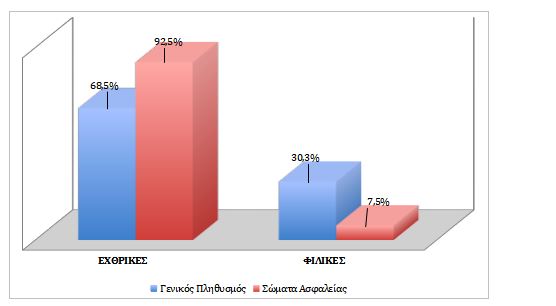 Έτσι, οι ερωτήσεις 4-11 επικεντρώνονται στο ζήτημα της πολιτισμικής ταυτότητας και της πολιτισμικής διαφοράς. Εδώ αρχίζει να διαφαίνεται ότι παρόλη την ομόψυχη καταδίκη της Χρυσής Αυγής, αντιλήψεις που είναι κεντρικές στο αξιακό σύμπαν της άκρας δεξιάς τυγχάνουν σημαντικά μεγαλύτερης αποδοχής. Το 35% του γενικού πληθυσμού πιστεύει ότι ο ελληνικός πολιτισμός είναι ανώτερος των άλλων, ενώ το ποσοστό αυτό αγγίζει το 55% στα Σώματα Ασφαλείας, και 47% σε όσους έχουν λάβει μέχρι δευτεροβάθμια εκπαίδευση. Αναφορικά με το αν η Ελλάδα είναι ρατσιστική χώρα, το 49,7% πιστεύει ότι δεν είναι, με το ποσοστό να φτάνει στο 65% στα Σώματα Ασφαλείας και χωρίς μεγάλες αποκλίσεις αναφορικά με τα άλλα γενικά χαρακτηριστικά του δείγματος. Στην ερώτηση εάν οι ερωτηθέντες αισθάνονται ότι η χώρα κινδυνεύει από πολιτισμική αλλοίωση, το 57,10% του γενικού πληθυσμού απαντά θετικά, με ποσοστό να φτάνει στο 72,50% στα Σώματα Ασφαλείας και το 68,80% σε όσους έχουν λάβει μέχρι δευτεροβάθμια εκπαίδευση, ενώ είναι επίσης αξιοσημείωτο ότι είναι πάνω από 50%, δηλαδή πλειοψηφικό, σε κάθε υποκατηγορία υποκατηγορία του δείγματος. Σε σχέση με το εάν τα παιδιά που γεννιούνται από μη Έλληνες γονείς στην Ελλάδα θα πρέπει να έχουν την δυνατότητα απόκτησης της ελληνικής ιθαγένειας, ένα συντριπτικό ποσοστό της τάξεως του 76,80% του γενικού πληθυσμού τάσσεται υπέρ, με ποσοστό και πάλι σημαντικά μικρότερο στα Σώματα Ασφαλείας – 52,50% – που ωστόσο, και σε αυτήν την περίπτωση, παραμένει πλειοψηφικό. Αυτό το εύρημα ίσως σηματοδοτεί μια θετική μεταστροφή σε σχέση με την αντιμετώπιση των μεταναστών δεύτερης γενιάς και τις αντιλήψεις για την ενσωμάτωσή τους στην Ελληνική κοινωνία. Ωστόσο, ένα ποσοστό της τάξεως του 62,60% (με ποσοστά άνω του 50%, δηλαδή πλειοψηφικά, σε κάθε υποκατηγορία που εξετάζεται) και του συντριπτικού ποσοστού της τάξεως του 90% στα Σώματα Ασφάλειας πιστεύει ότι ο αριθμός των μεταναστών στην χώρα μας είναι υπερβολικά μεγάλος. Επίσης, το 58,50% του γενικού πληθυσμού (και πάλι με ποσοστά άνω του 50%, δηλαδή πλειοψηφικά, σε κάθε υποκατηγορία που εξετάζεται) και το συντριπτικό ποσοστό του 87,50% των Σωμάτων Ασφαλείας και το 71,90% όσων έχουν λάβει μέχρι δευτεροβάθμια εκπαίδευση πιστεύουν ότι η μετανάστευση σχετίζεται με την εγκληματικότητα. Στην ίδια λογική, ένα σημαντικό μέρος της κοινωνίας φαίνεται να έχει οικειοποιηθεί το απαξιωτικά φορτισμένο λεξιλόγιο της Χρυσής Αυγής καθώς το 50,10% του γενικού πληθυσμού και το 72,5% των Σωμάτων Ασφαλείας συμφωνεί με την χρήση ή χρησιμοποιεί τον όρο «λαθρομετανάστης». Αξιοσημείωτο, είναι το ότι στην συνείδηση της κοινωνίας φαίνεται να έχει εμπεδωθεί η διαφορά μεταξύ μετανάστη και πρόσφυγα σε ποσοστό 89,50% του γενικού πληθυσμού χωρίς σημαντικές αποκλίσεις επί των επιμέρους χαρακτηριστικών του δείγματος. Αυτό που βλέπουμε δηλαδή είναι ότι παρά την ομοψυχία που αφορά την καταδίκη των εγκληματικών ενεργειών της Χρυσής Αυγής, σημαντικό μέρος του πληθυσμού αντιλαμβάνεται την πολιτισμική διαφορά ως απειλή και στέκεται απαξιωτικά απέναντί της (π.χ. ο Ελληνικός πολιτισμός είναι ανώτερος, οι μετανάστες συνδέονται με την εγκληματικότητα), χωρίς ωστόσο να θεωρεί απαραίτητα μια τέτοια στάση «ρατσιστική».